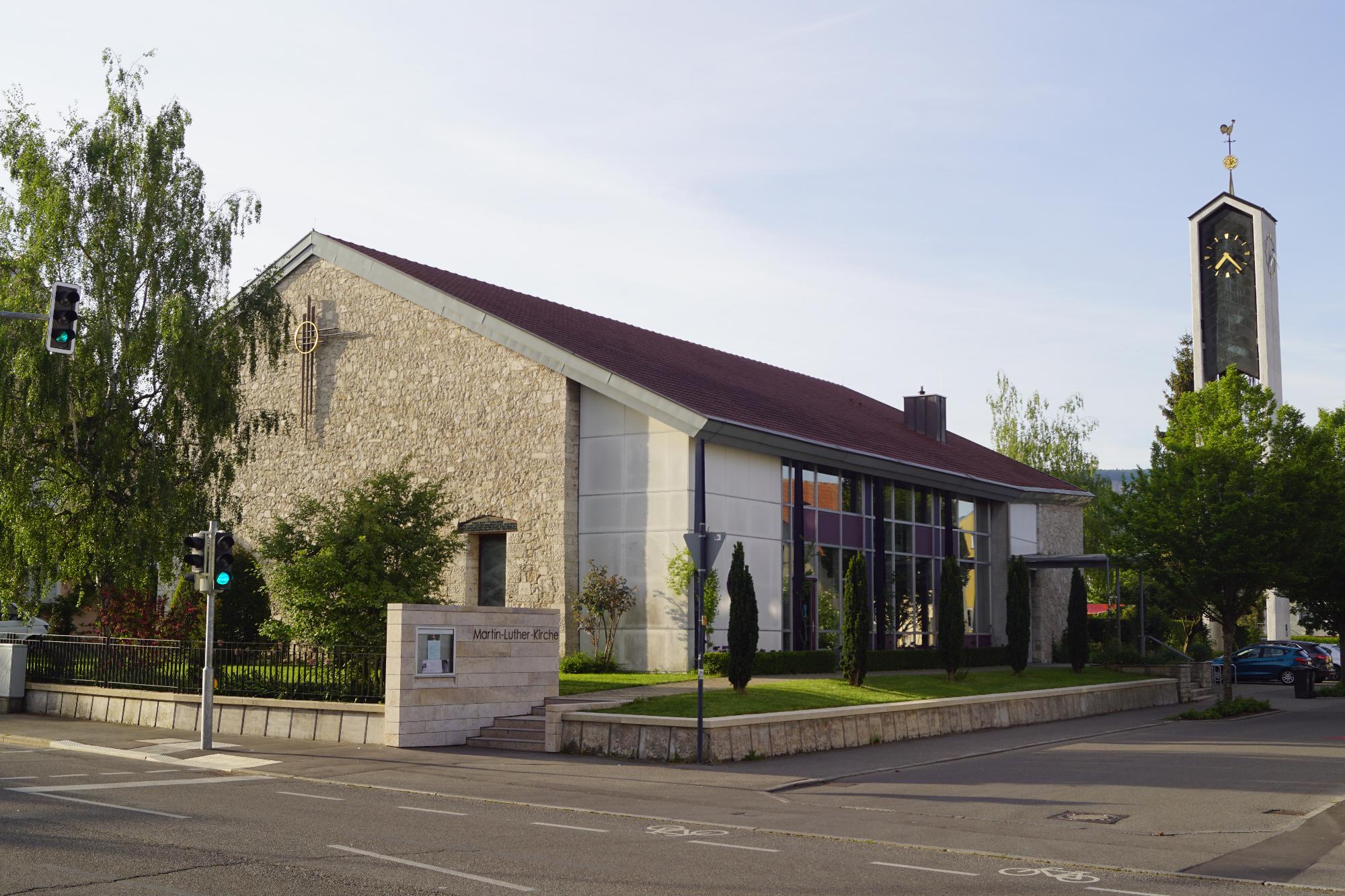 Die Martin-Luther-Kirche wurde von 1961 bis 1964 gebaut und im Zuge einer Generalrenovierung 1992-93 grundlegend umgestaltet. Zu ihren Besondernheiten gehört ein wandfüllendes Kirchenfenster, das von Prof. Rudolf Yelin d.J. in Dallglastechnik gestaltet wurde und zu seinen herausragendsten Werken gehört. Den Kirchturm ziert eine ca. 80 cm große, goldene Lutherrose - unseres Wissens die einizge Lutherrose auf einer Kirchturmspitze.